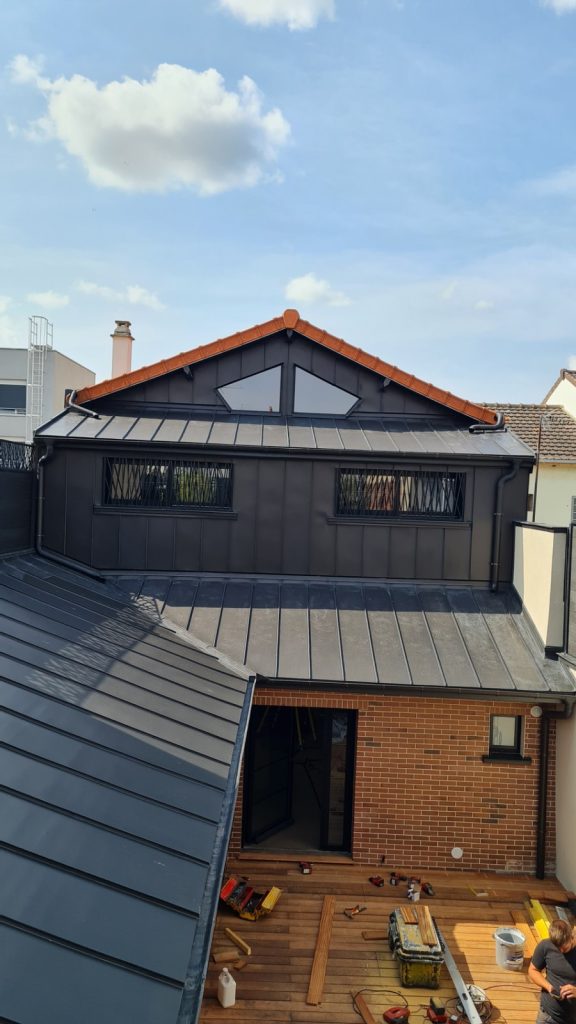 Bardage et couverture en zinc anthracite, aménagements intérieurs et extérieurs.